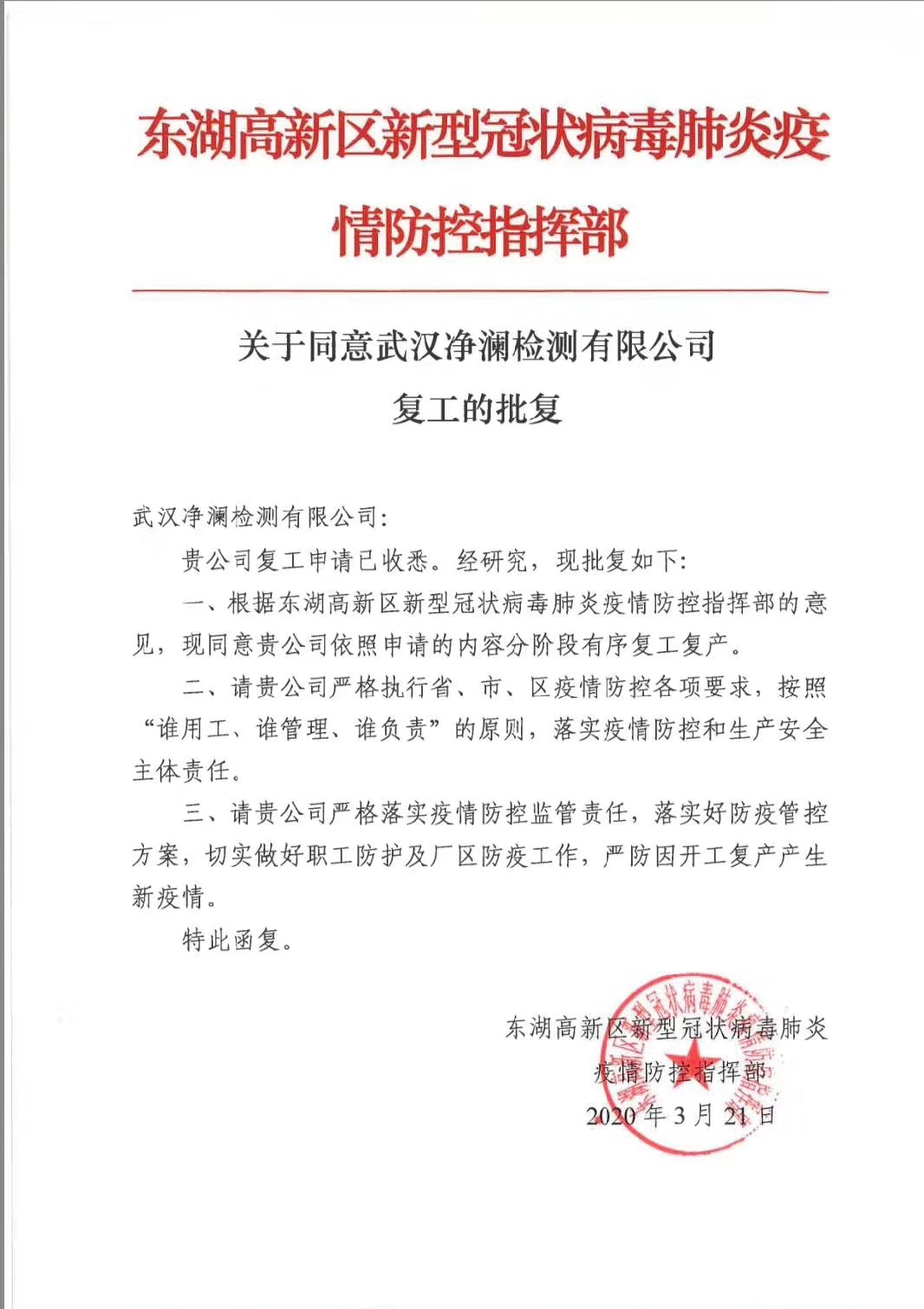 我司復工申請已批復,現將陸續返崗,還請各位領導和廣大客戶知曉。正式檢測工作開始前,有任何需要請隨時和相關業務工程人員聯系!感謝您在這段特殊時間的理解和體諒!